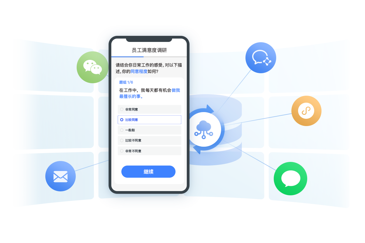 问卷满足私域多场景分发:可透过小程序、微信、企业微信、邮件、短信等十几种方式实现互动